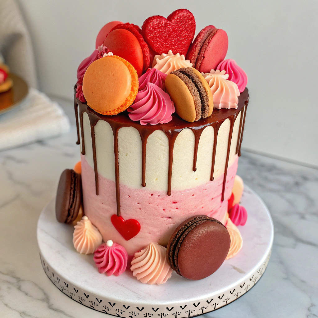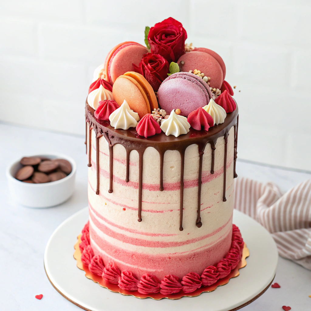 Celebrate love with our Sweetheart Indulgence Cake, a stunning creation in red, pink, and white buttercream. Adorned with delicate macarons, crisp meringues, rich chocolates, fondant hearts, and your choice of fondant or silk roses, this cake is finished with a luscious milk chocolate ganache drip. A showstopping centerpiece for Valentine’s Day, anniversaries, or any romantic celebration.Highlights